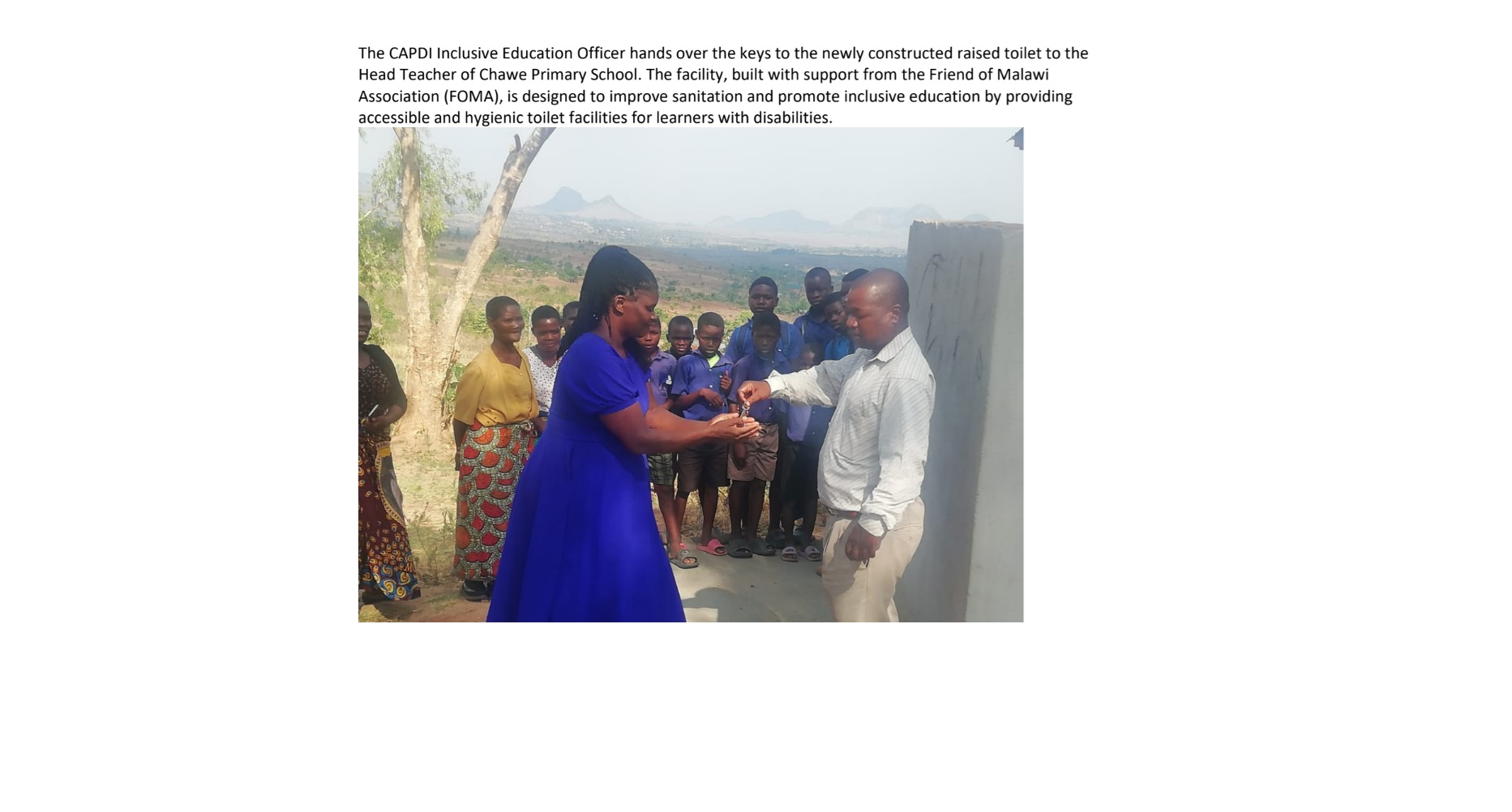 Sungani Chitandale, Programmes Officer with CAPDI explained that this project aims to enhance accessibility to appropriate sanitation facilities for learners with disabilities. By constructing raised toilet blocks with handrails and ramps, students with physical disabilities will benefit from improve hygiene, and contribute to an inclusive learning environment.
